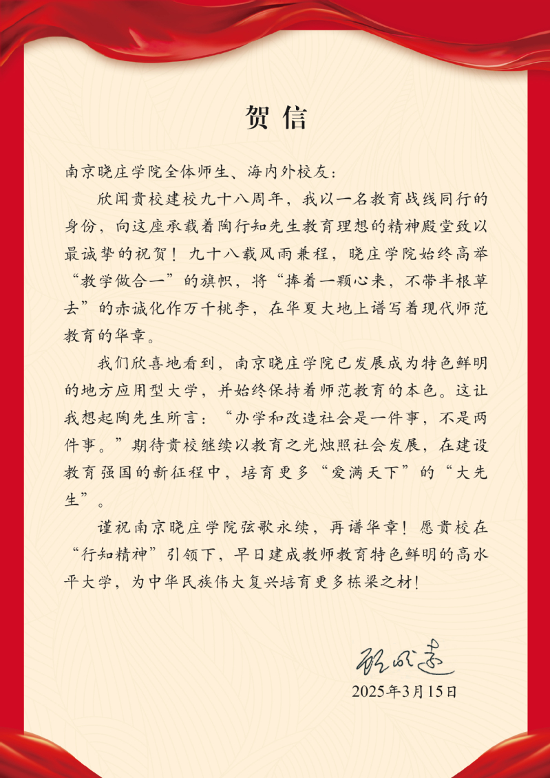 在3月15日晓庄建校98周年纪念日当天,顾明远先生发来贺信,向华体会平台全体师生和海内外校友送去祝福,并寄予殷切期望。