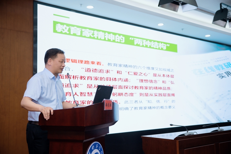 潘东标作《教育家精神—大国良师的时代画像》主题报告。他指出,教育家精神浸润着民族文化的人格气韵,升华了中国特有的师道精神,形成了“大国良师”的时代画像,构成了新时代教育事业的精神灯塔和行动指南。他勉励广大教师,要胸怀国之大者,锻造“明道信道”的铸魂之师;要有宏大格局,锻造“充满活力”的强国之师;要有鲜明品格,锻造“以文化人”的模范之师;要有国际视野,锻造“文明互鉴”的大同之师;要有强大动力,锻造“业精善学”的创新之师。