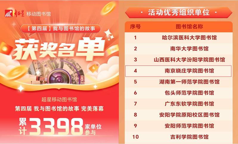 近日,由超星移动图书馆主办的第四届“我与图书馆的故事”摄影大赛顺利落幕。我校图书馆在全国 3398 家参与单位中脱颖而出,荣获“优秀组织单位”称号,全国仅 30 家单位获此殊荣。