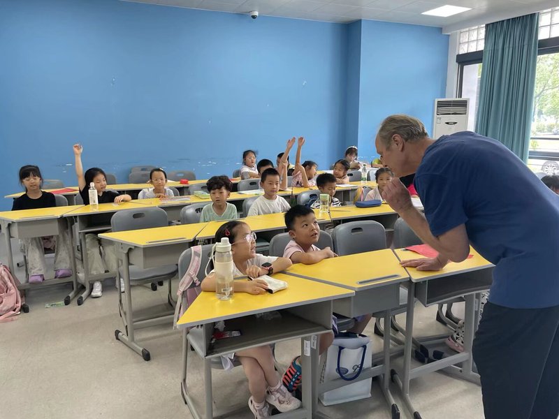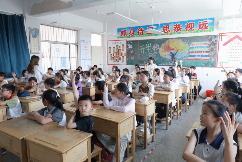 实践团邀请了2012届校友、南京市竹山小学大队辅导员孙莉老师走进课堂,孙莉老师以“生日”为主题,精心设计教学环节,围绕礼貌用语、年龄、数字分层展开,有效提升了孩子们的学习效果与思维能力;此外,还邀请外教老师为孩子们授课,孩子们在聆听与交流中积累日常表达词汇,锻炼听说能力。