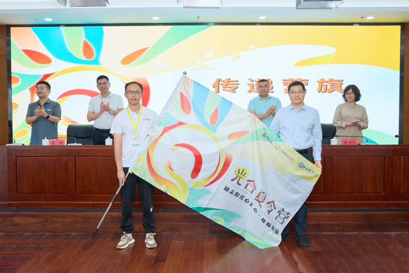 李晓明为学员代表云南省红河州小新街乡华泽阳光希望小学校长黄孝春授予营旗,营旗顺利传递代表光合夏令营的精神延续不断,也见证了光合夏令营一路的成长。
