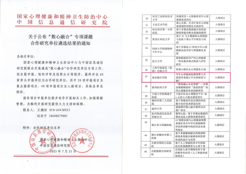 近日,国家心理健康和精神卫生防治中心与中国信息通信研究院联合公布了“数心融合”专项课题合作研究单位名单,我校心理健康研究院申报的项目《学生心理健康监测预警与关爱指导系统云平台的研发与推广》成功入选,成为全国60家合作研究单位之一。