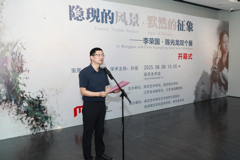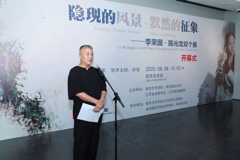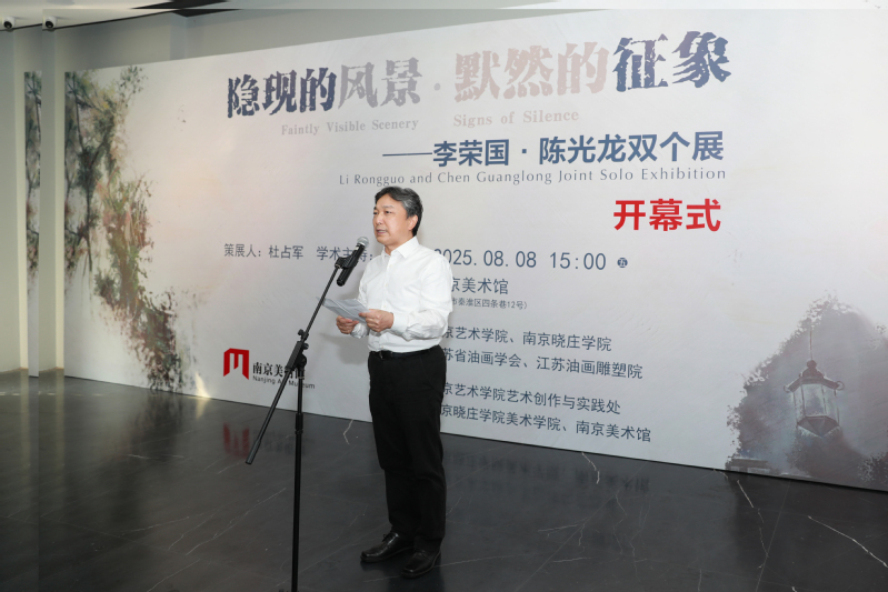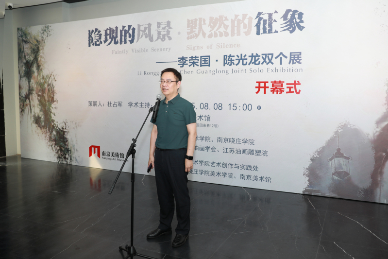 张凌浩代表南京艺术学院向两位画家表示祝贺。他表示,李荣国毕业于南艺,又回到母校在艺术创作管理岗位深耕多年,其作品萦绕着强烈的怀旧情愫,是对记忆的打捞和时代的凝视,践行了南艺“闳约深美”的校训。他指出,李荣国的“风景”与陈光龙的“人物”虽形态不同,但同为 “70 后” 艺术家,他们共享时代基因,在精神层面契合,此次展览为两校艺术交流搭建了平台,并期待能够激励更多青年画家创作出更多无愧于时代的绘画精品。