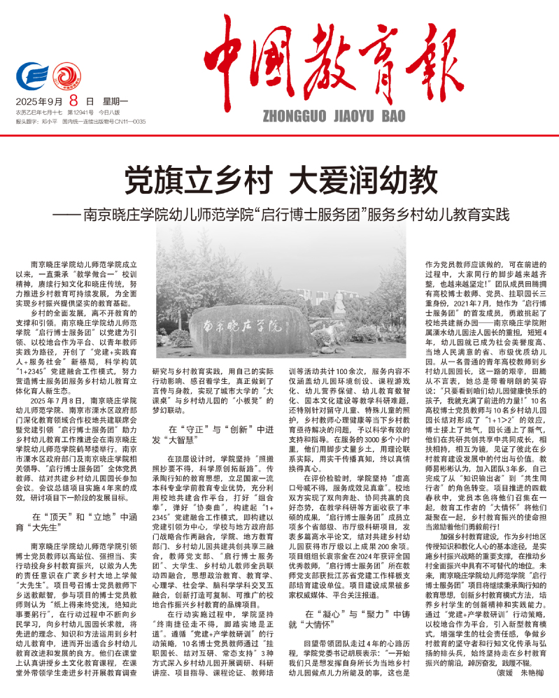 9月8日,《中国教育报》专题报道了我校幼儿师范学院教师第二党支部作为“江苏省党建工作样板支部”的创建成效,重点关注该支部以党建引领助力乡村幼儿教育振兴的创新实践和显著成效。