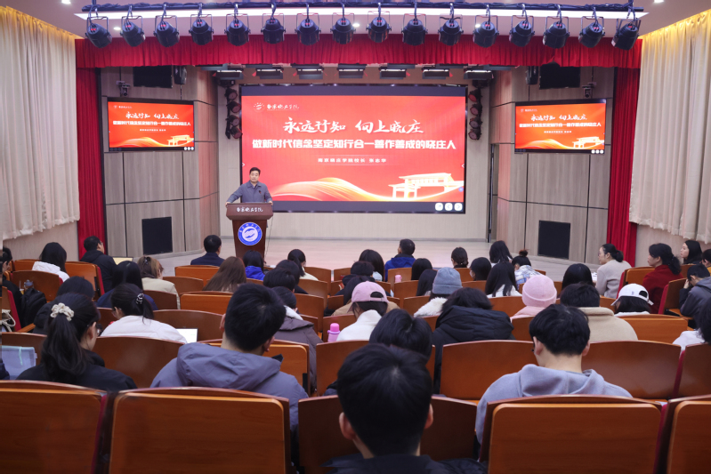 12月1日,校长张志华教授向2025级全体硕士研究生宣讲党的二十届四中全会精神,并以《永远行知 向上晓庄——做新时代信念坚定知行合一善作善成的晓庄人》为题讲授专题思政课。副校长赵向军主持本次活动,研究生处负责人与研究生辅导员一同参加。