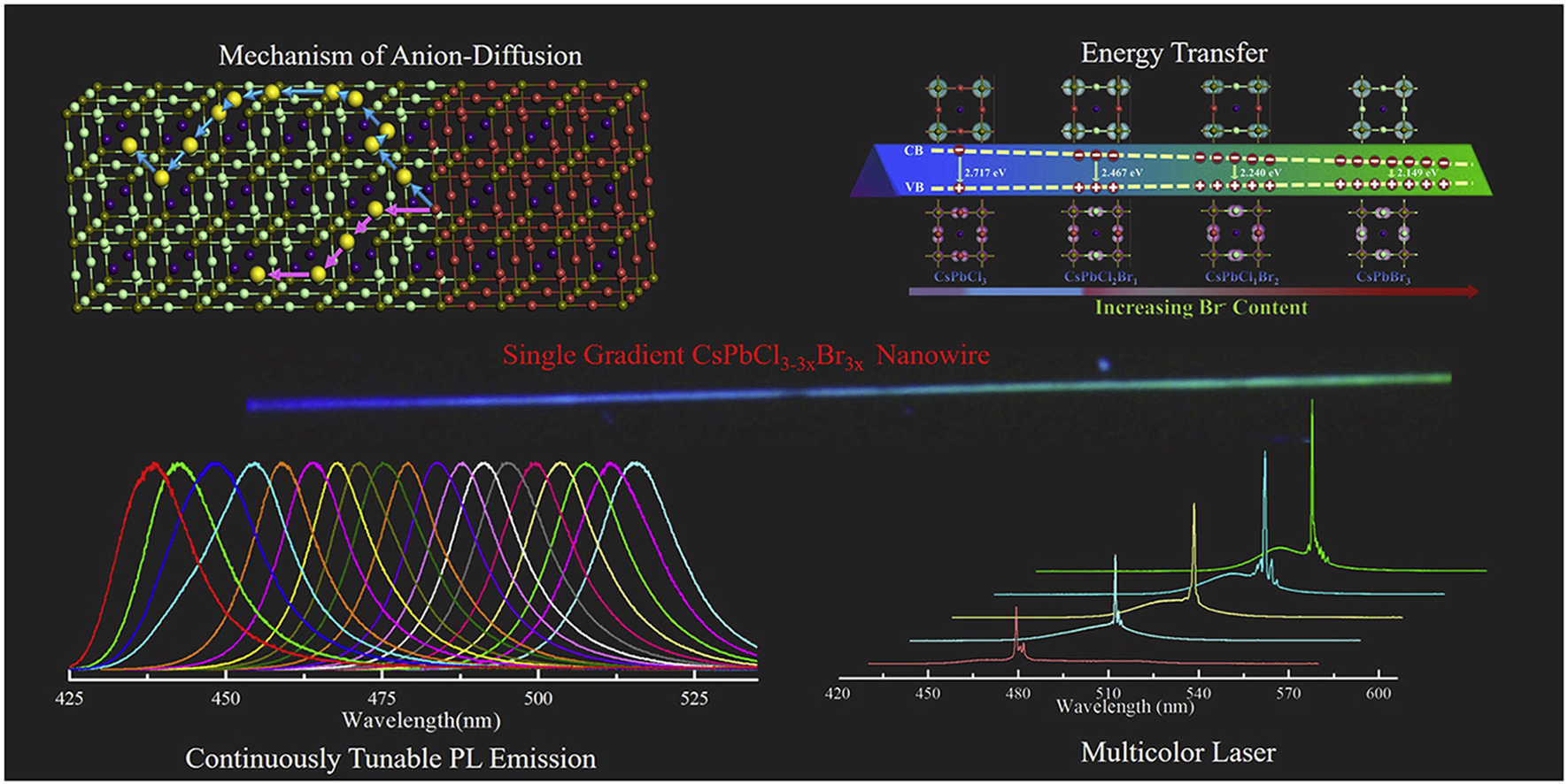 在该项研究中,研究人员首先通过改进的化学气相沉积技术制备了高质量钙钛矿纳米线状微腔,然后基于阴离子固相迁移反应,在单根纳米线上成功实现了宽带隙可调荧光发光。结合密度泛函理论,研究人员解析了钙钛矿纳米结构中阴离子迁移的原子路径,揭示了离子迁移的基本过程,并阐明其离子迁移的来源——小的离子迁移激活能,为材料离子迁移、相分离及光学性质的研究奠定了坚实的理论及实验基础。动力学实验进一步佐证了理论结果,随着反应时间的变化,单根纳米线历经三个主要过程:首先,由发光一致的纳米线逐渐变化为带隙可调纳米线;然后,纳米线整体带隙可调,但是其带隙随着反应时间增加而减小;最后,纳米线被整体同化,转化为发光一致的纳米线,但整体发光波长较开始阶段红移。实现的纳米线状微腔具备规则的几何结构、光滑的表面及宽带可调谐特性,可同时作为增益介质及光学微腔,进而实现单根纳米线宽带可调谐激光输出,实验上成功获得了480~525nm的宽带可调谐微纳多色激光。