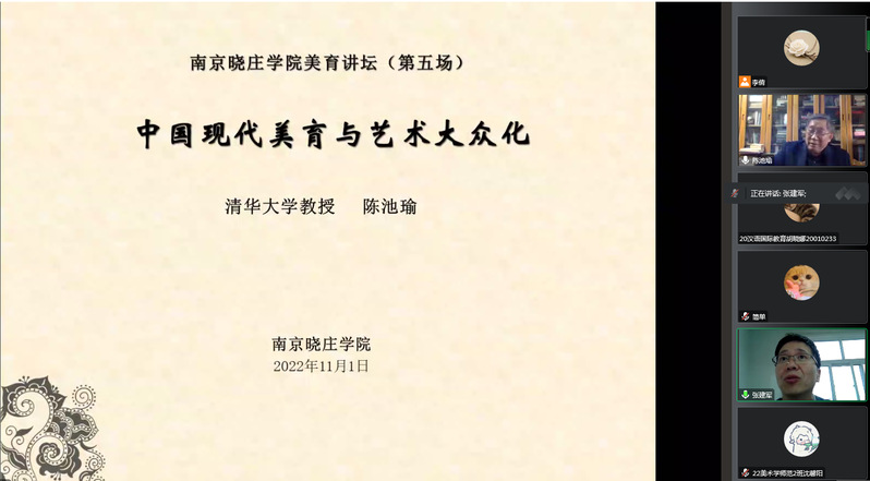 11月1日,清华大学陈池瑜教授应我校美术学院邀请,为我校师生作题为“中国现代美育与艺术大众化”的线上专场学术报告会。此次学术讲座是学校美育讲坛的第五场,美院师生、校外美育浸润计划基地的中小学教师代表以及全校近500名师生线上参加。