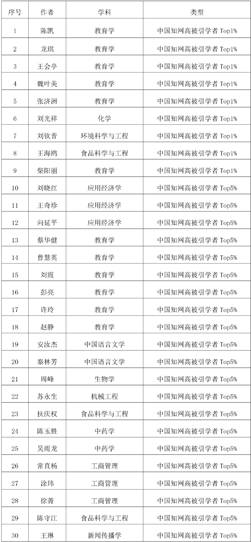 近日,中国知网中国科学文献计量评价研究中心基于中国知网收录的国内学术期刊论文和会议论文,首次开展学者学术影响力客观评价并发布了“2024中国知网高被引学者”名单。在本次遴选中,我校30位教师上榜,其中陈凯、龙琪、王会亭、魏叶美、张济洲、刘光祥、刘钦普、王海鸥、柴阳丽等9位教师入选“2024中国知网高被引学者TOP1%”名单,另有21位教师入选“2024中国知网高被引学者TOP5%”名单。